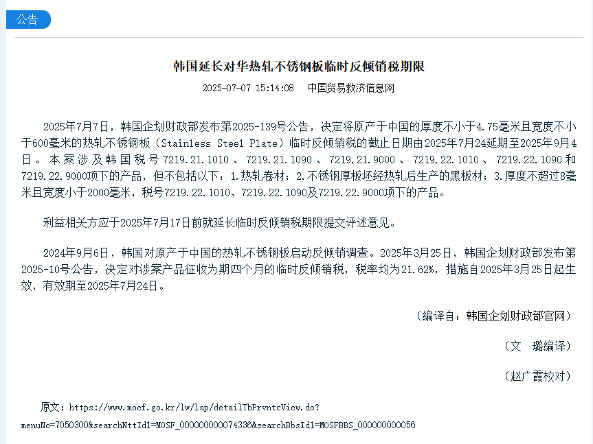 2025年7月7日,據中國貿易救濟信息網一則公告《韓國延長對華熱軋不銹鋼板臨時反傾銷稅期限》顯示,“2025年7月7日,韓國企劃財政部發布第2025-139號公告,決定將原產于中國的厚度不小于4.75毫米且寬度不小于600毫米的熱軋不銹鋼板(Stainless Steel Plate)臨時反傾銷稅的截止日期由2025年7月24延期至2025年9月4日。本案涉及韓國稅號7219.21.1010、7219.21.1090、7219.21.9000、7219.22.1010、7219.22.1090和7219.22.9000項下的產品,但不包括以下:1.熱軋卷材;2.不銹鋼厚板坯經熱軋后生產的黑板材;3.厚度不超過8毫米且寬度小于2000毫米,稅號7219.22.1010、7219.22.1090及7219.22.9000項下的產品?!?/p>