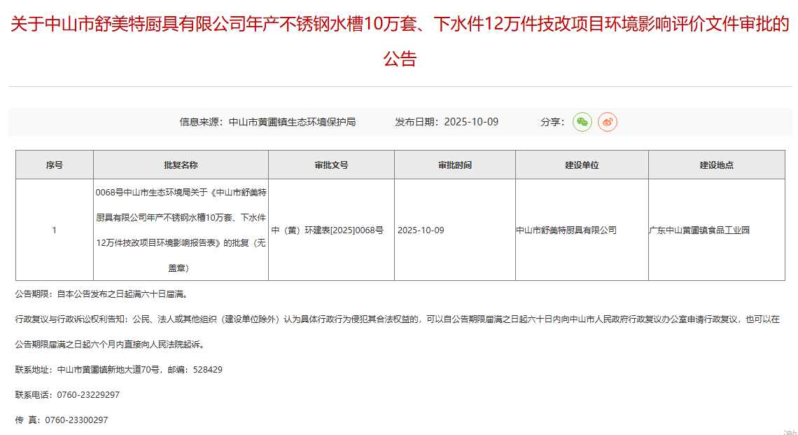 2025年10月9日,中山市黃圃鎮(zhèn)生態(tài)環(huán)境保護(hù)局就中山市舒美特廚具有限公司年產(chǎn)不銹鋼水槽10萬套、下水件12萬件技改項(xiàng)目環(huán)境影響評價(jià)文件作出審批意見并對外進(jìn)行公告,公告期限:自本公告發(fā)布之日起滿六十日屆滿。