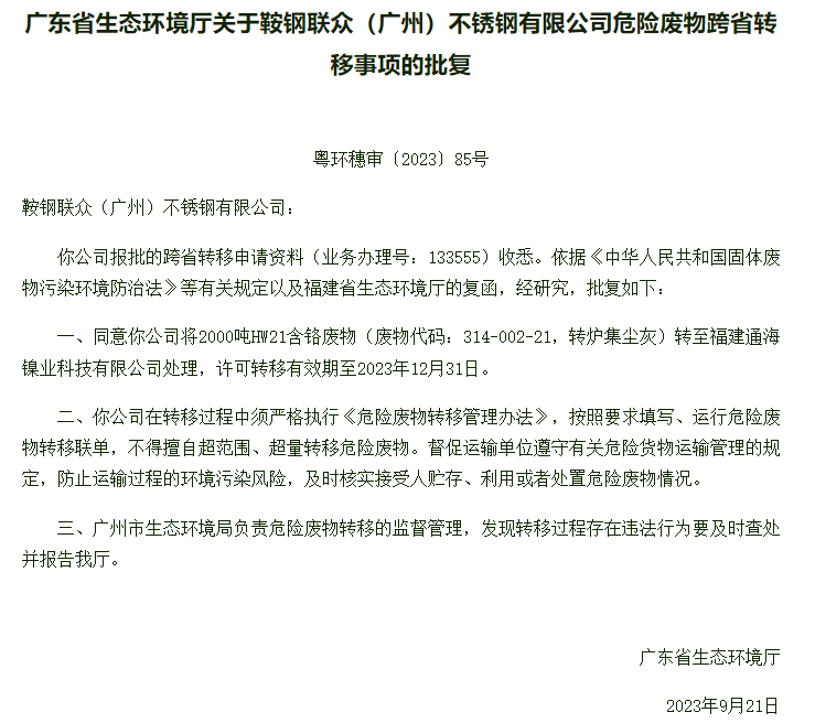 9月21日,廣東省生態環境廳就鞍鋼聯眾(廣州)不銹鋼有限公司危險廢物跨省轉移事項作出批復,據顯示,同意鞍鋼聯眾將2000噸HW21含鉻廢物(廢物代碼:314-002-21,轉爐集塵灰)轉至福建通海鎳業科技有限公司處理,許可轉移有效期至2023年12月31日。(來源:廣州市生態環境局)